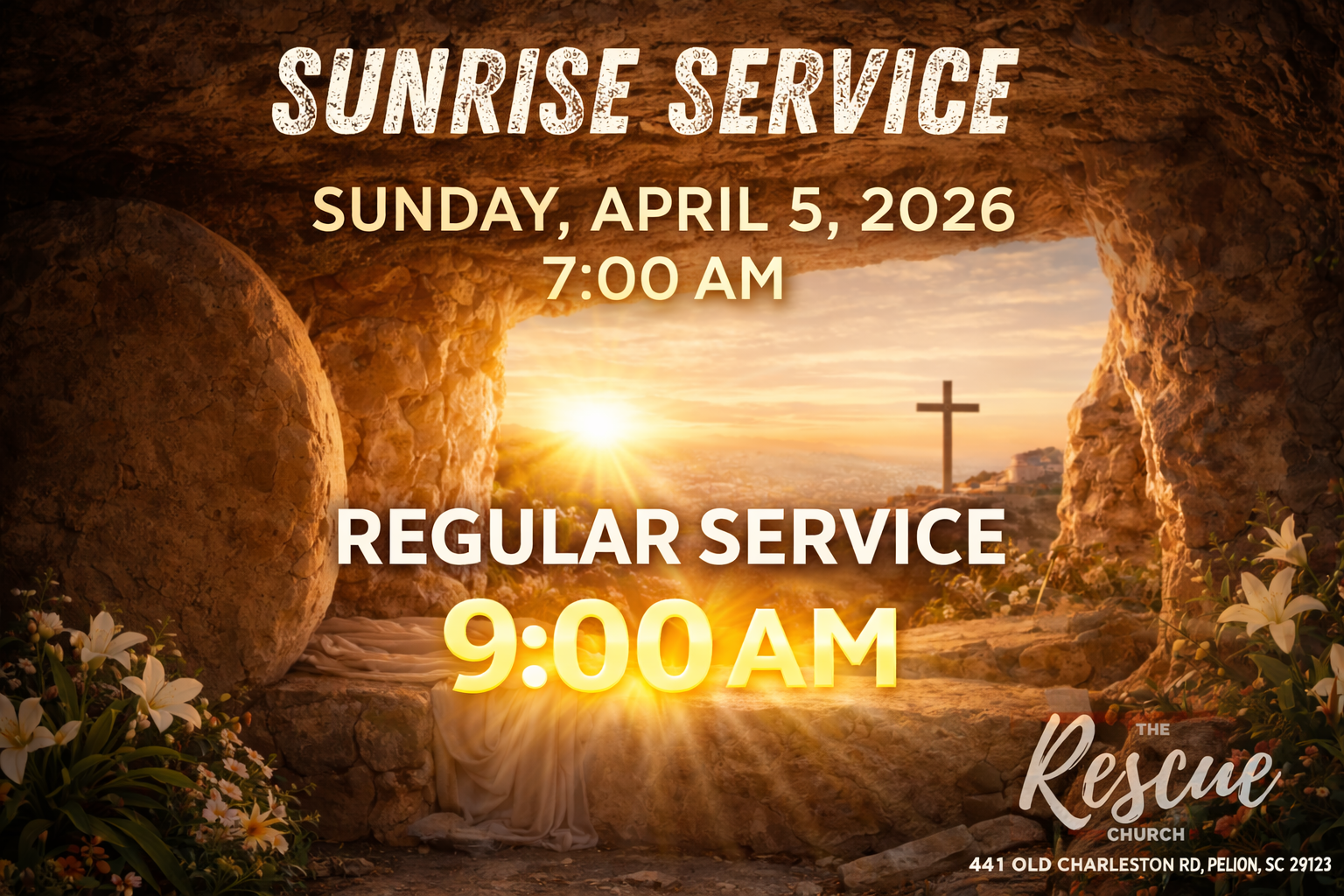 Sunrise Service Sunday, April 5, 2026 7:00 AM 8:00 AM 07:00 08:00 The Rescue Church 441 Old Charleston Road Pelion, SC, 29123 United States (map) Google Calendar ICS
